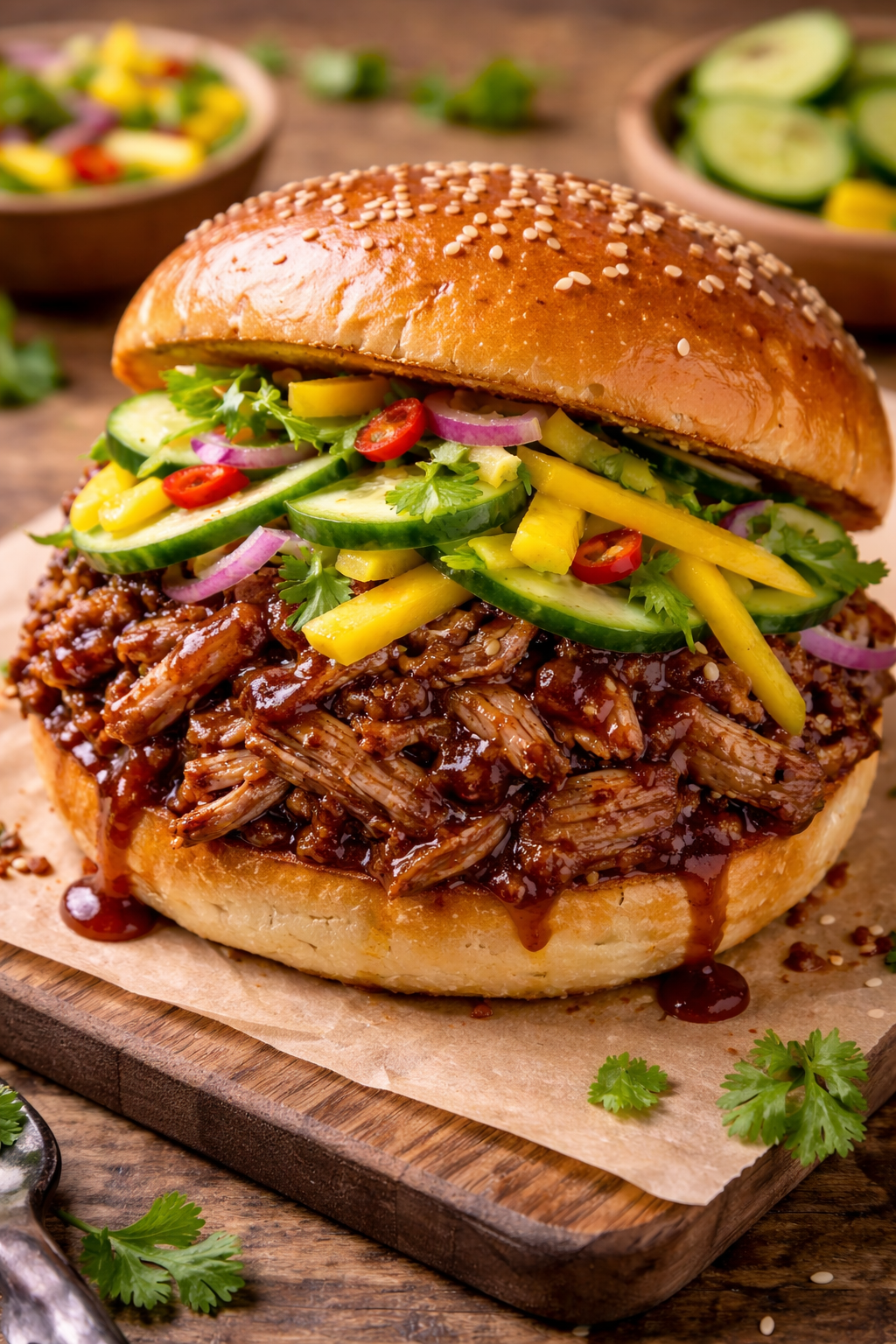 Pulled Pork Sandwich – Gurken Mango Salat – Kafir Limette – Erdnuss